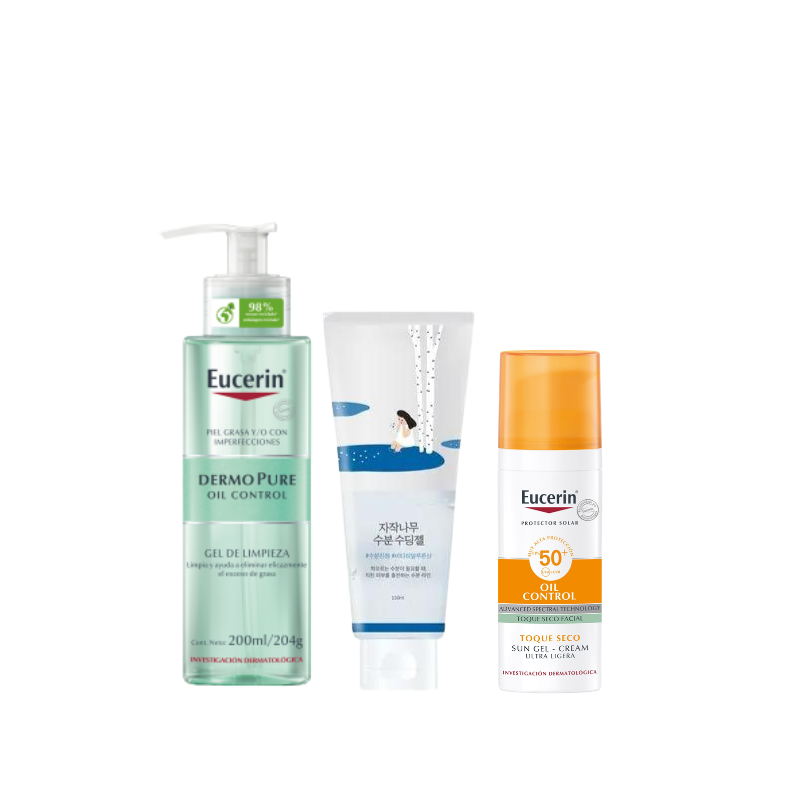Esta rutina está enfocada en limpiar, hidratar y proteger la piel mientras controla el exceso de grasa y previene imperfecciones. Inicia con el Eucerin DermoPure Limpiador Facial, que elimina impurezas, suciedad y sebo sin resecar, dejando la piel fresca y equilibrada. Luego, el Round Lab Hidratante en Gel aporta hidratación ligera, ayudando a mantener la piel suave sin sensación pesada ni pegajosa.