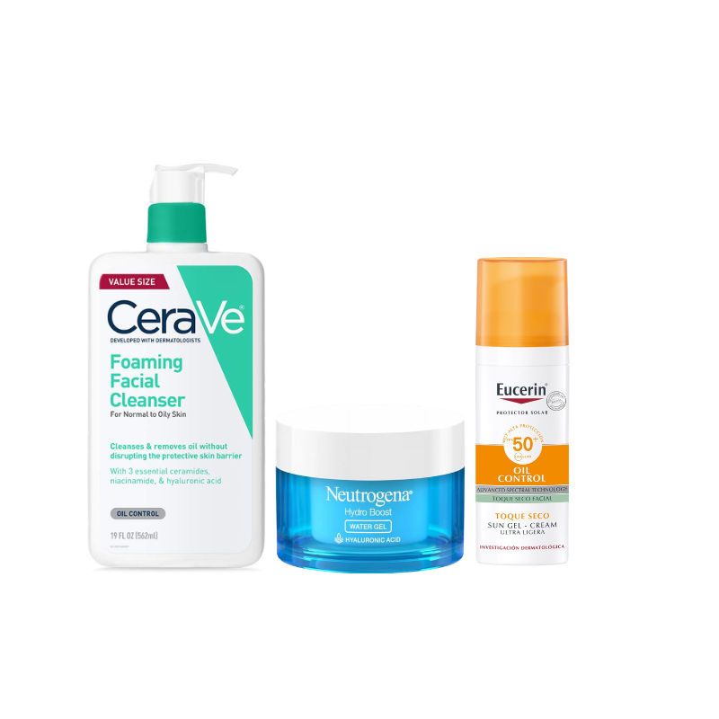 La rutina de cuidado para piel normal a mixta combina productos clave para mantener la piel equilibrada y saludable. Comienza con el CeraVe Foaming Cleanser 19 oz, que limpia profundamente sin resecar, eliminando el exceso de sebo e impurezas. Luego, hidrata con el Neutrogena HydroBoost Water Gel 50ml, que proporciona una hidratación intensa y duradera gracias al ácido hialurónico, dejando la piel suave y flexible. Finaliza con el Eucerin Oil Control Toque Seco SPF50 50ml, un protector solar que controla el brillo y proporciona una alta protección UV, manteniendo la piel mate y protegida durante todo el día. Esta rutina diaria limpia, hidrata y protege, ideal para mantener el equilibrio de la piel normal a mixta.